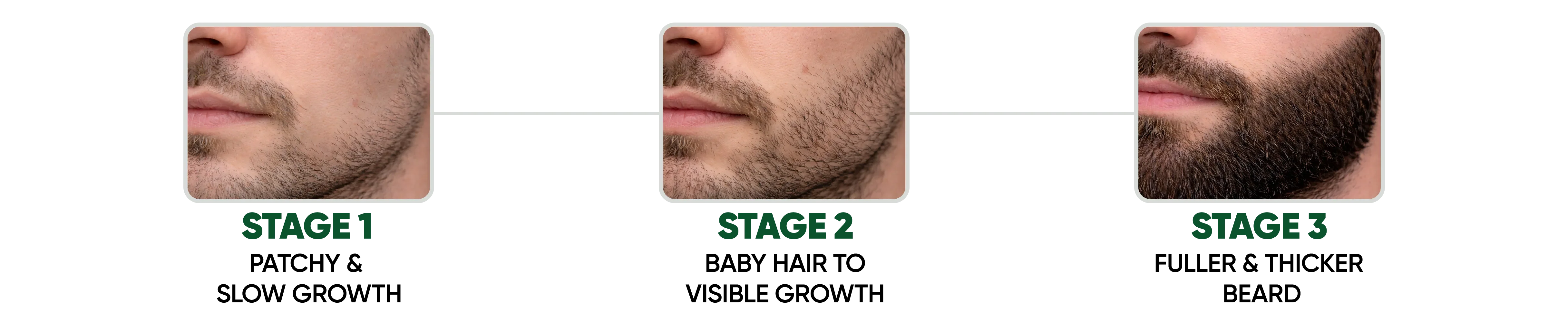 Improved appearance of patchy and uneven beard growth. Beard looks fuller and thicker in some areas. Stronger-looking beard hair with regular use.